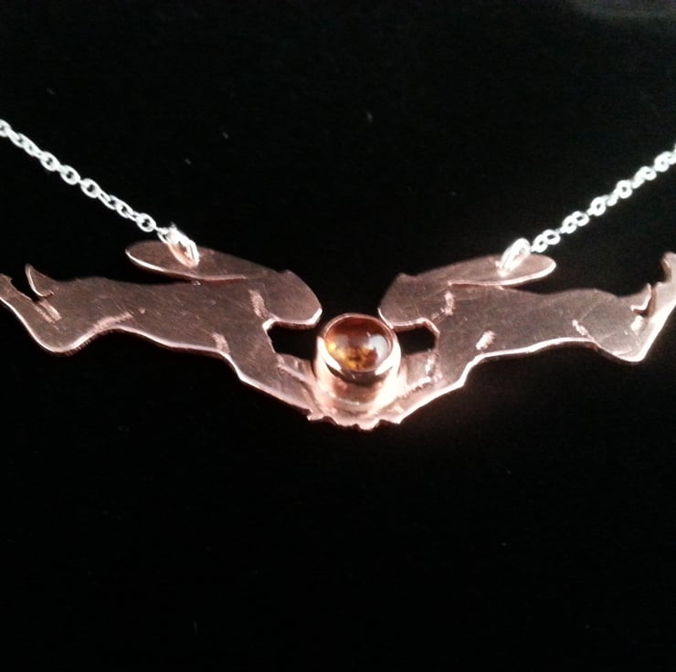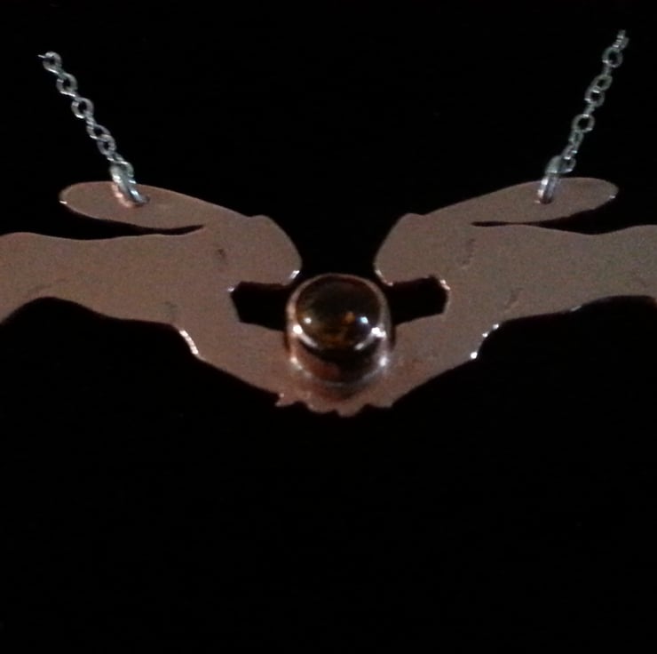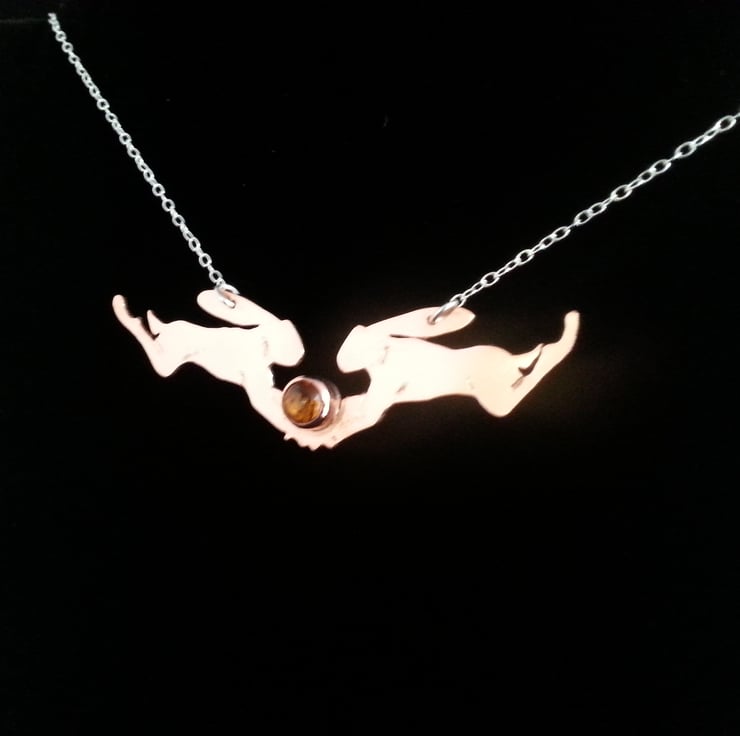 The hares have been pierced out by hand and detailed with some hand engraving, the central stone setting holds a beautiful , natural 7mm golden amber cabochon representing the sun rise of each new day.