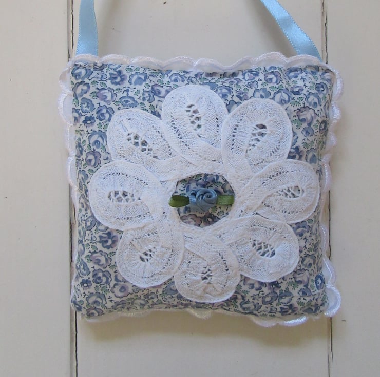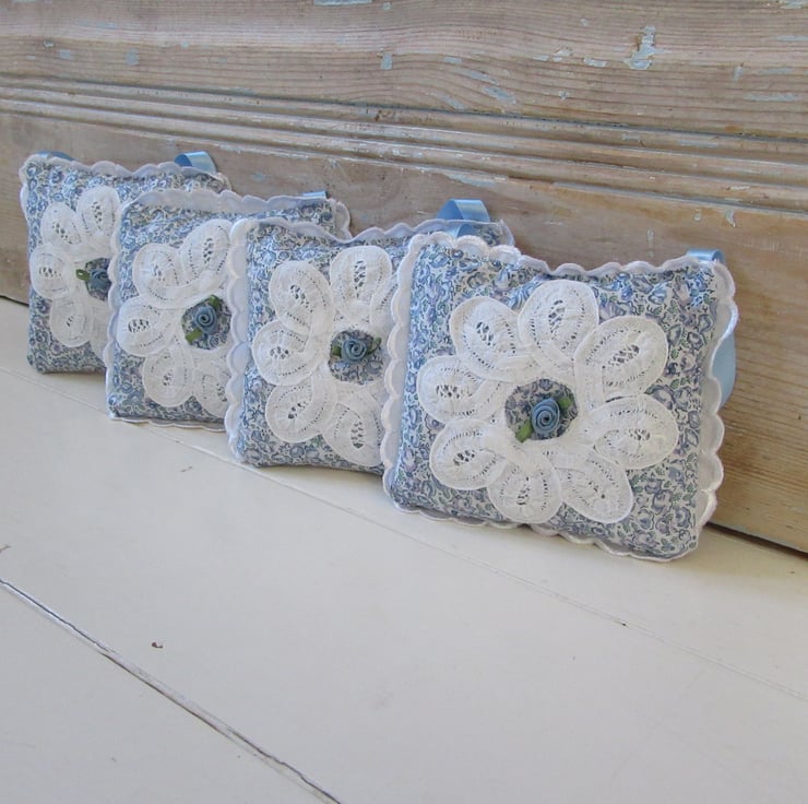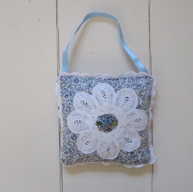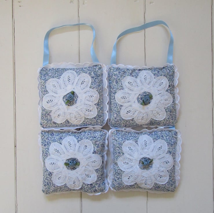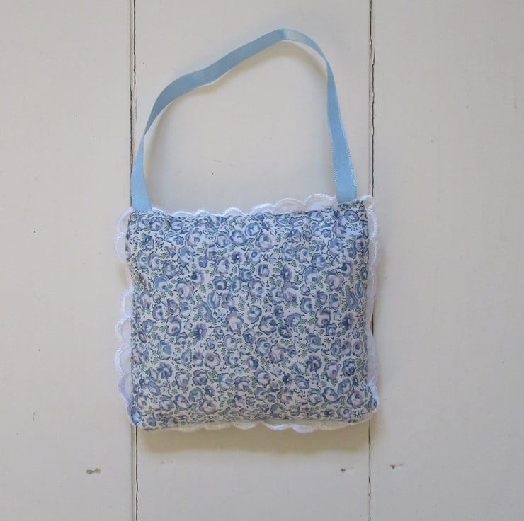 Lavender bags made using the softest Liberty print tana lawn fabric and a vintage lace fabric doily sewn on the front. In the middle of the doily there is a blue ribbon rose.There is a white picot edging sewn around the outside.Each bag has a 20cm blue hanging ribbon handle, so they can be hung in your wardrobe, around a hanger, or just popped into a drawer.It is generously stuffed with home grown English lavender, grown here in Suffolk and dried by myself.Simply gently crush the lavender to release its wonderful scent.