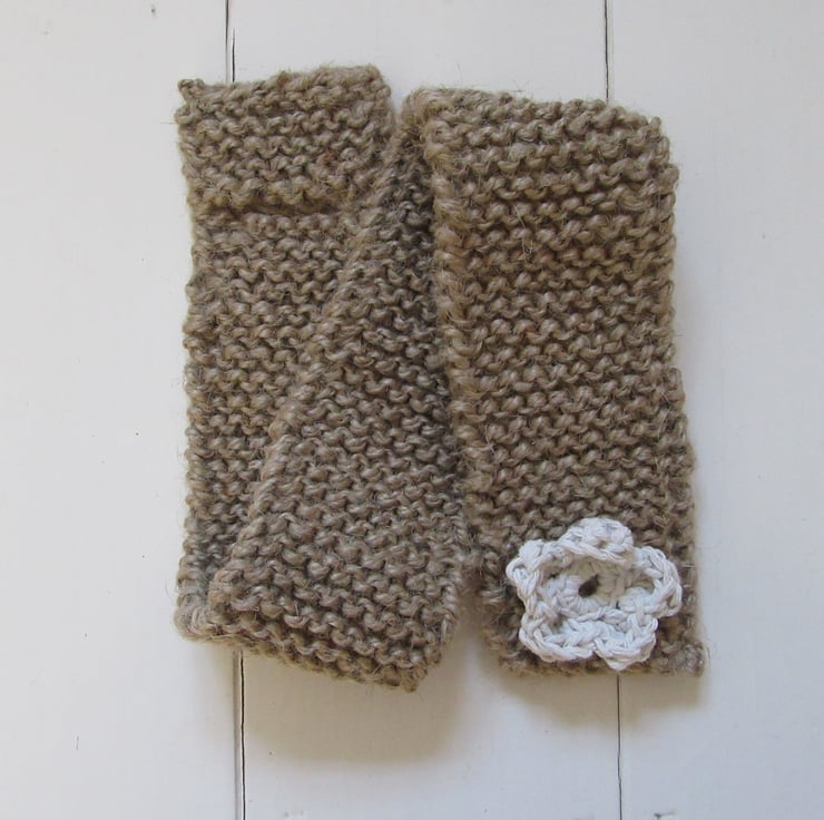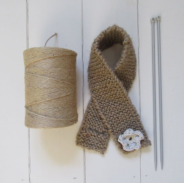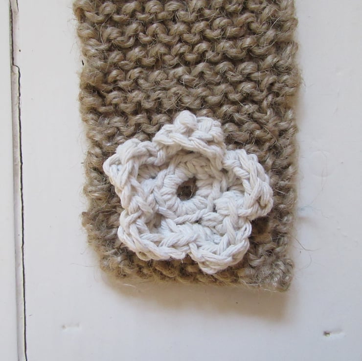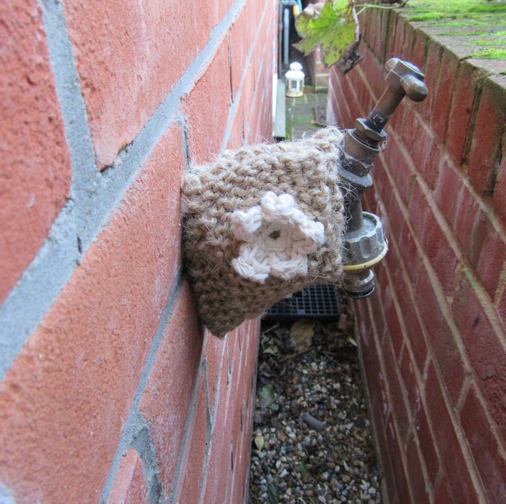 A knitted scarf using natural jute for your outside garden tap. One end of the scarf has a little crocheted daisy flower sewn on it , to act as a button. The other end has a buttonhole. Simply wrap the scarf around your outside garden tap securing it by popping the daisy button through the buttonhole. The natural colour of this jute scarf allows it to compliment the garden environment perfectly.