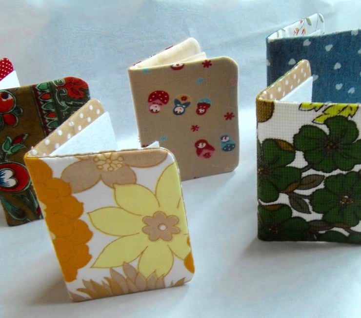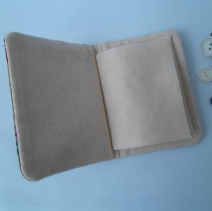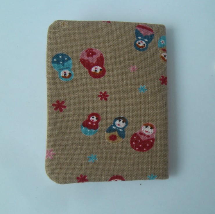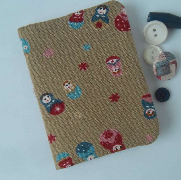 Mini needle book in fabric which has a Russian doll print. Lightly stiffed with interfacing.