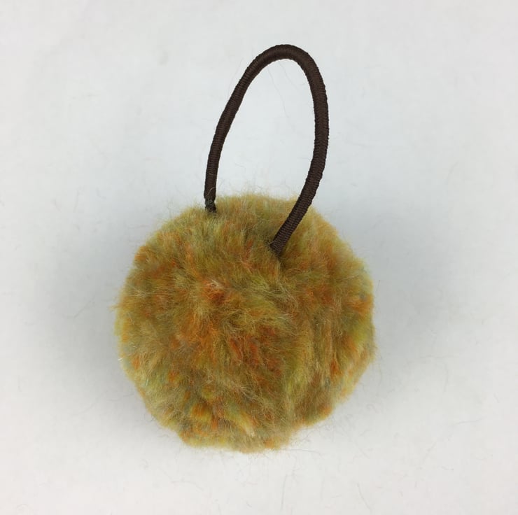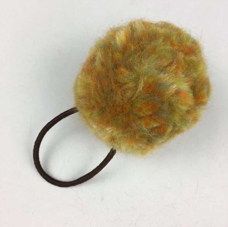 A super soft and fluffy pom pom in a blend of yellow merino wool has been made into a fun, pretty hair bobble by attaching it to a brown elastic hair tie.
