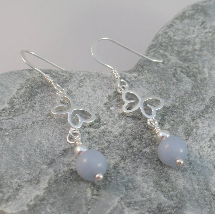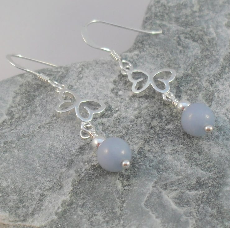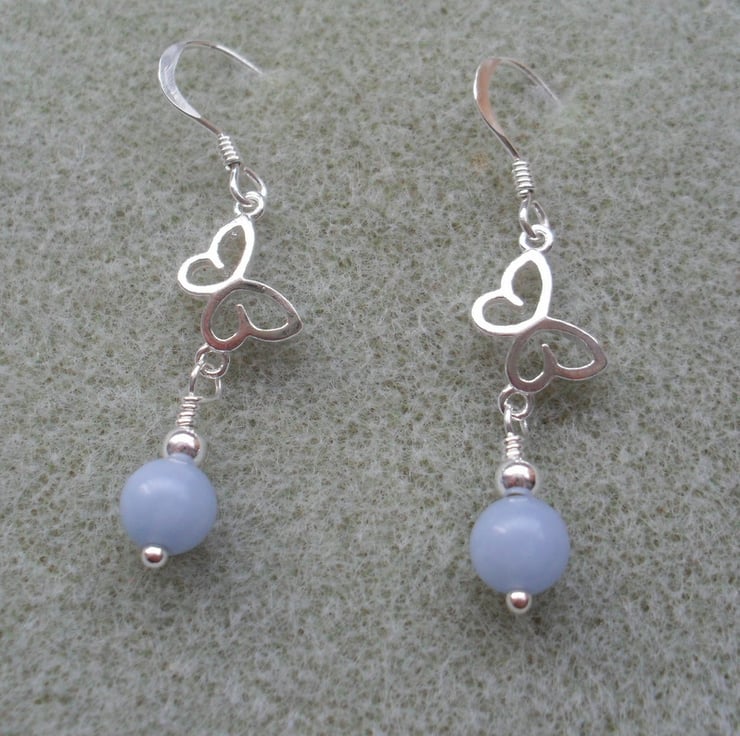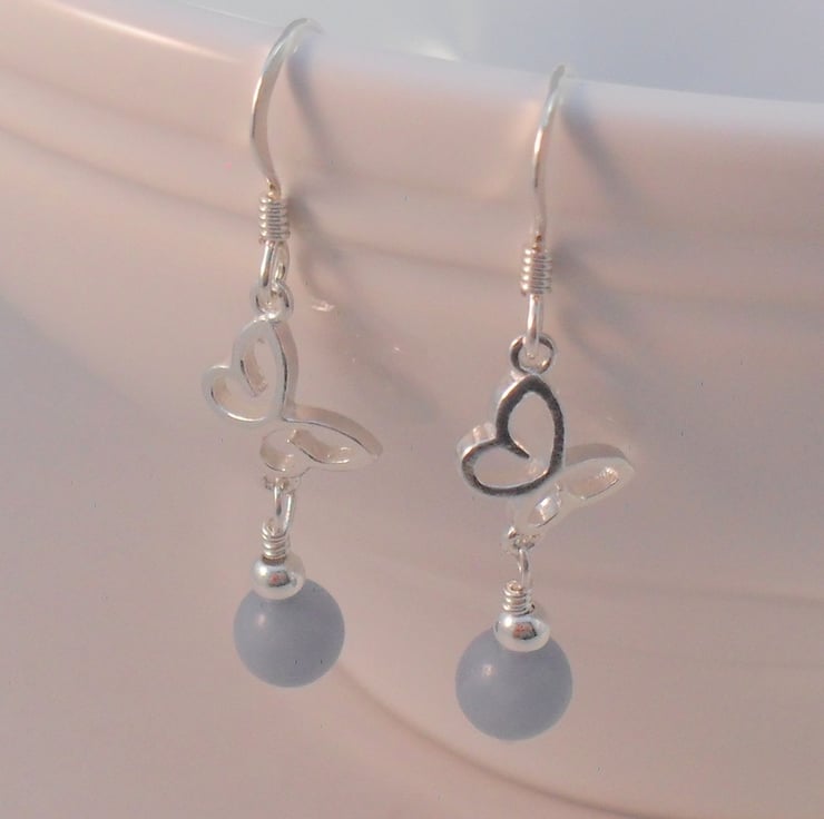 Angelite semi precious gemstones with butterfly sterling silver connectors are attached to sterling silver ear wires.