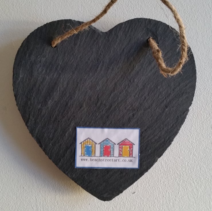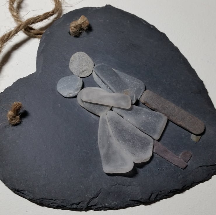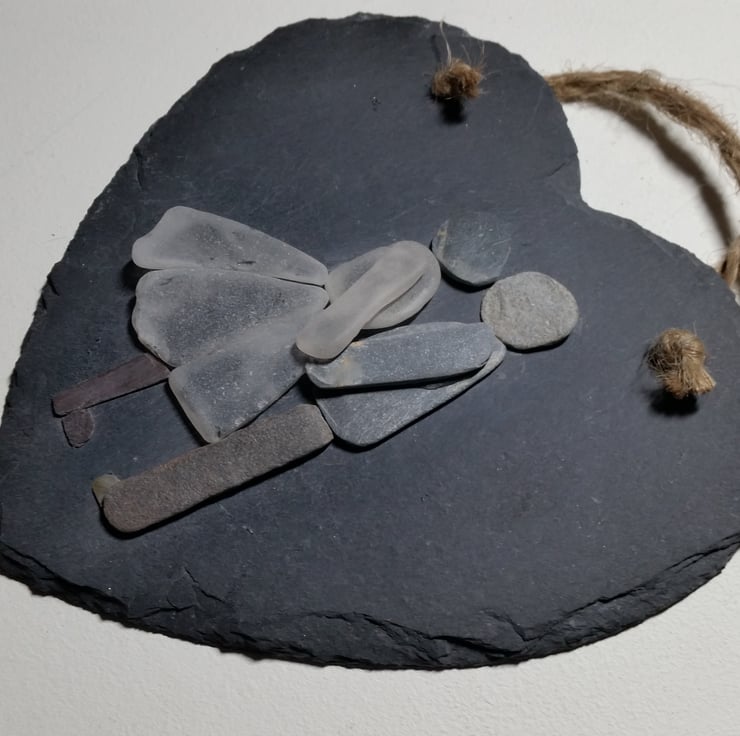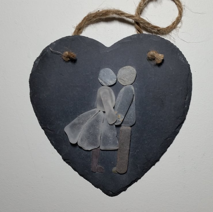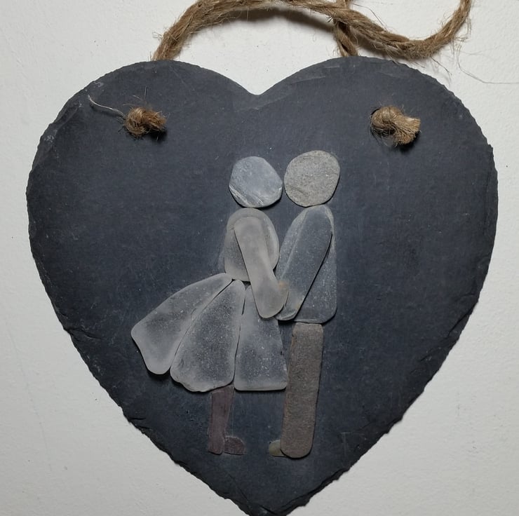 A pebble and sea glass kissing couple set on a 15cm x 15cm slate heart ready to hang on your wall.