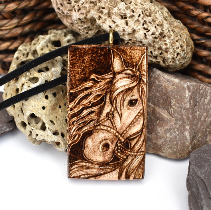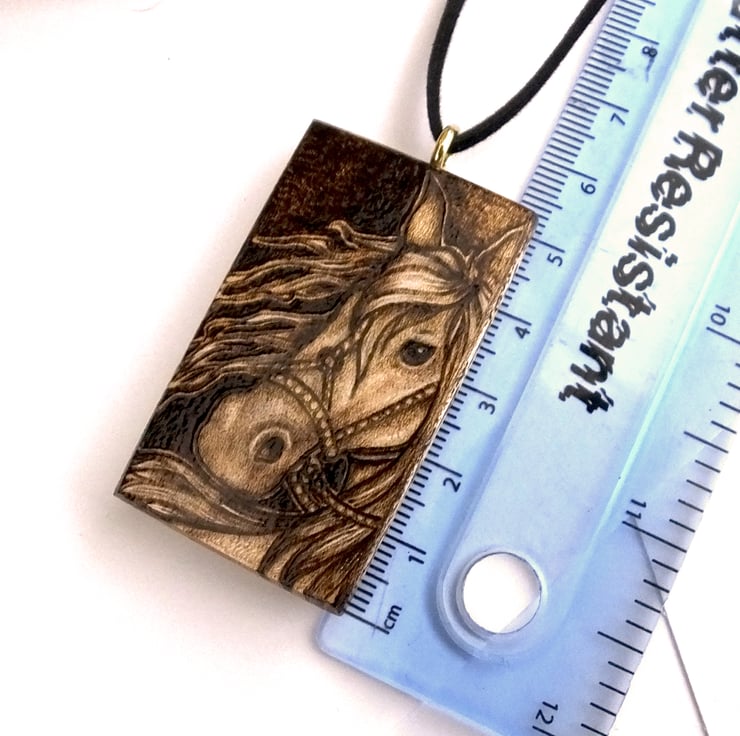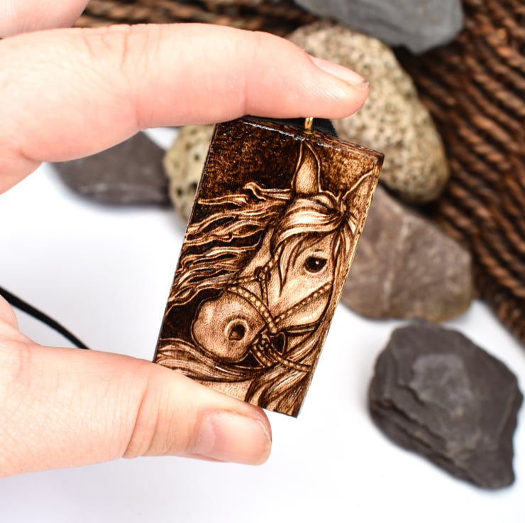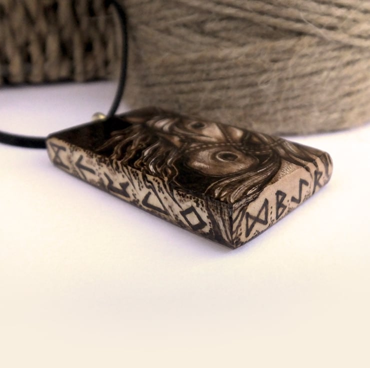 This is an original pyrography artwork, sycamore wood, chunky pendant with a wild eyed Viking inspired horse with flowing locks. The sides are decorated with runes, and highlights lifted with prismacolor. A lovely horse or pony fan gift or a follower of Norse mythology and runes.