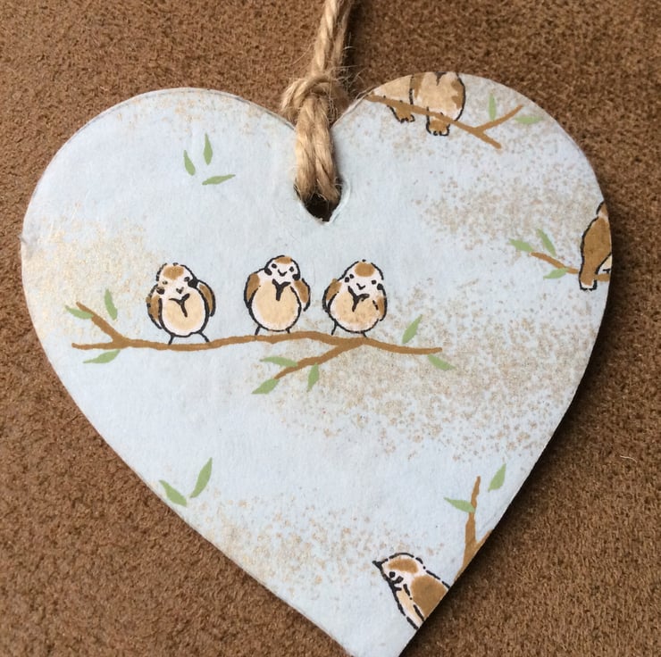 Wooden Heart Decoration, covered with silk paper with a cute bird design.
