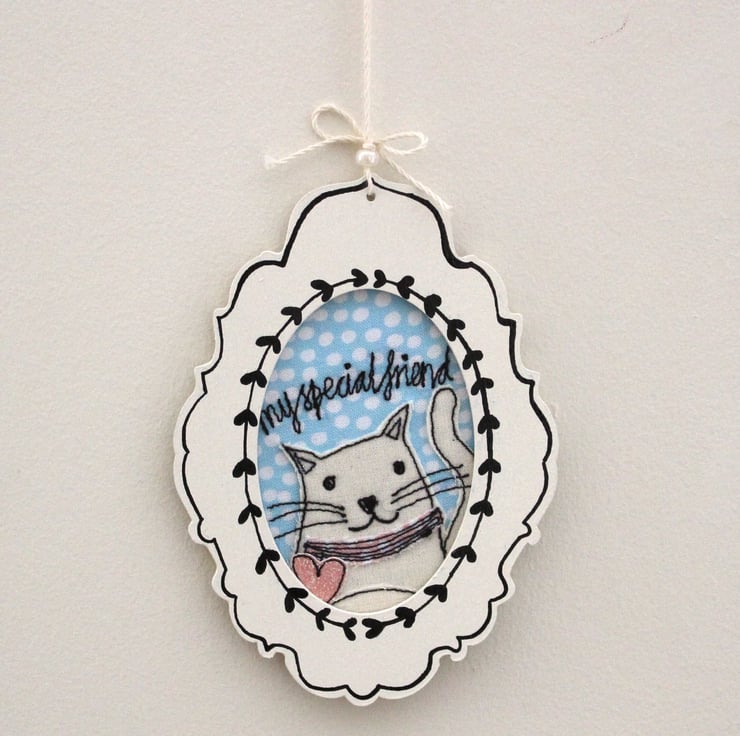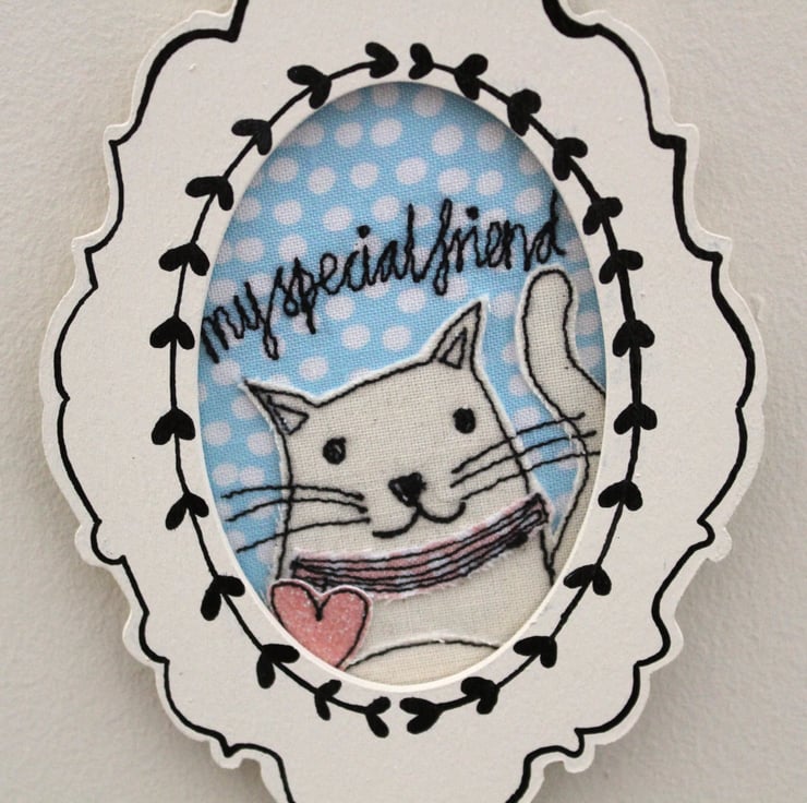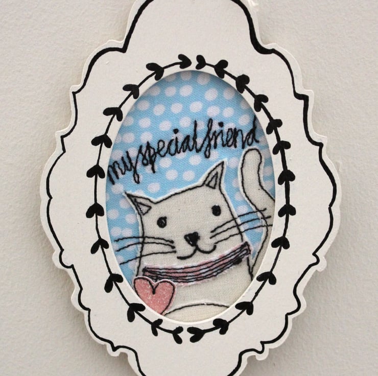 'My special friend' cat is created using free hand machine embroidery, cotton cloth, pink