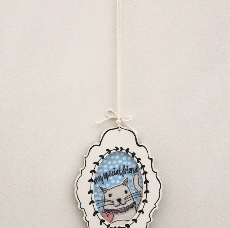 A little cat, sits in a wooden frame gazing out, with the words 'my special friend' floating above his head.
