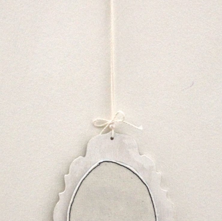 glitter fabric, a glass bead and a wooden frame. A hand drawn black line detail on the wooden frame, is applied using pen and ink. There is a string to hang.