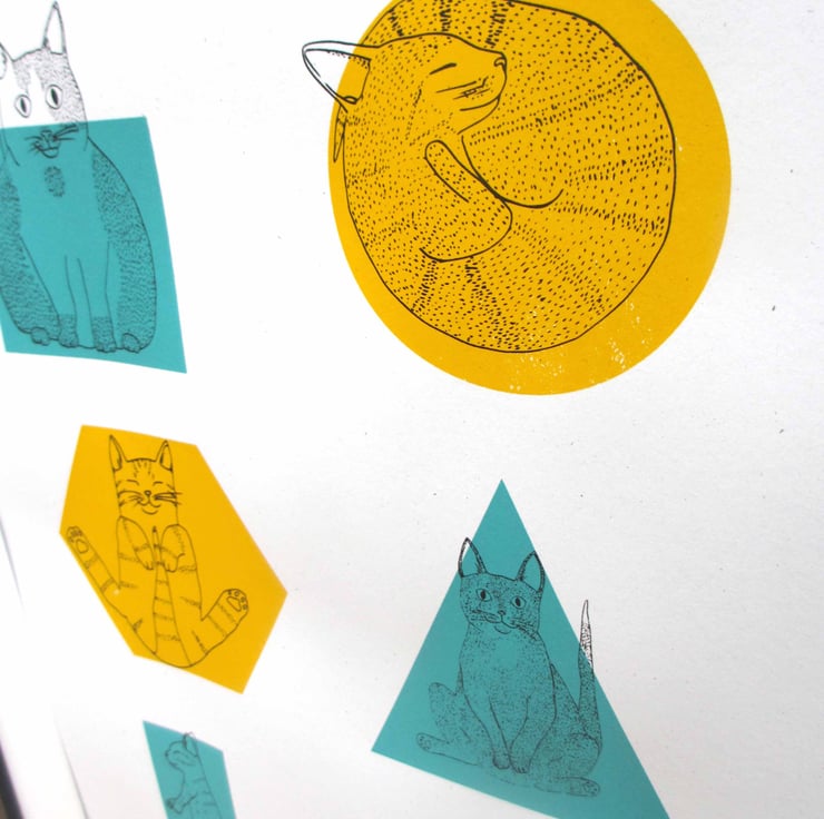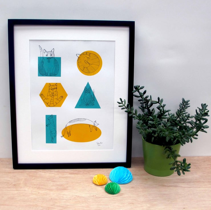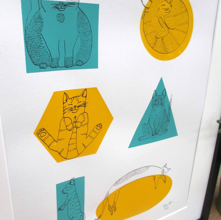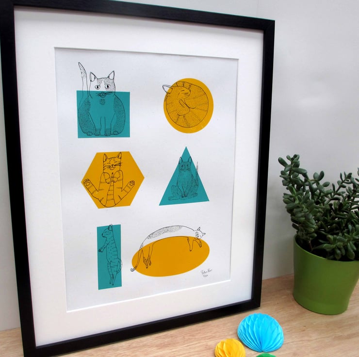 A beautiful three colour screen print (yellow, teal and black) featuring an illustration of a collection of 6 cats trying to fit into a selection of shapes, as they often do! Creating a fun and colourful print of shapes and cats!