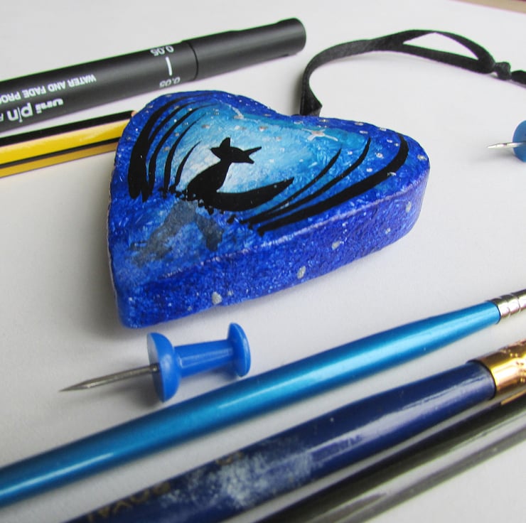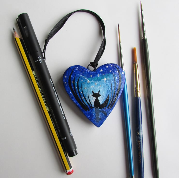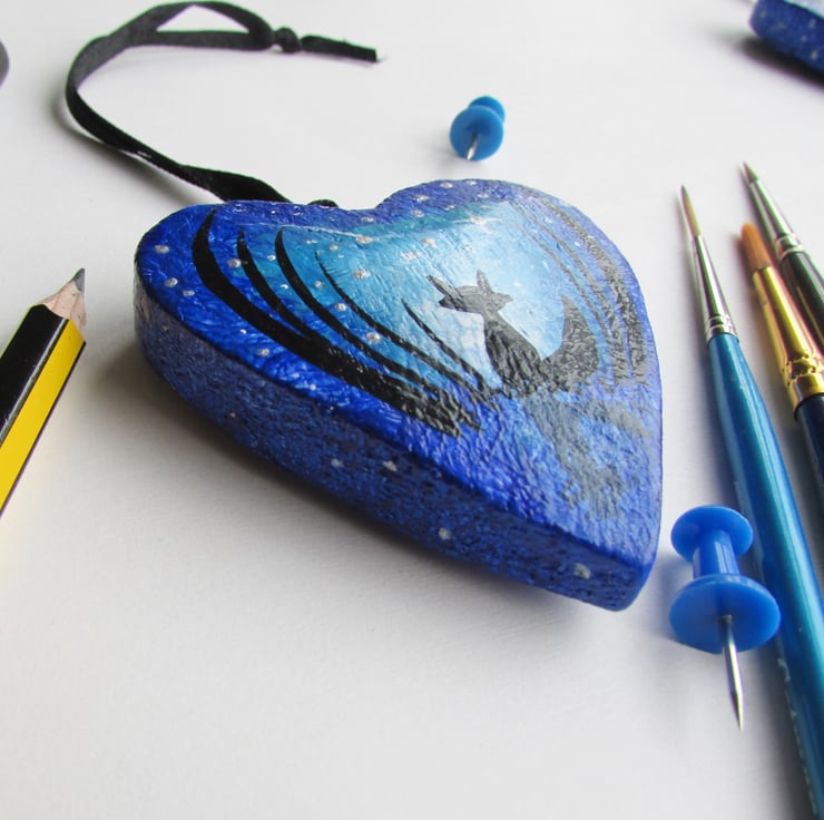 Fox in silhouette by Moonlight, Hanging Heart , blue wooden heart hand painted with a little Fox.