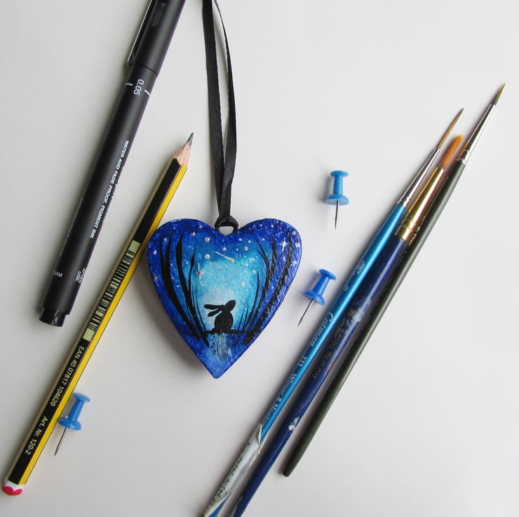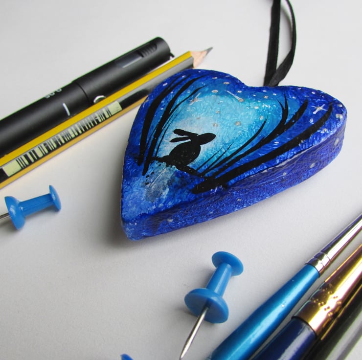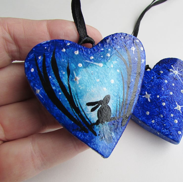 Hare in silhouette by Moonlight, Hanging Heart , blue wooden heart hand painted with a little Hare or Bunny Rabbit.