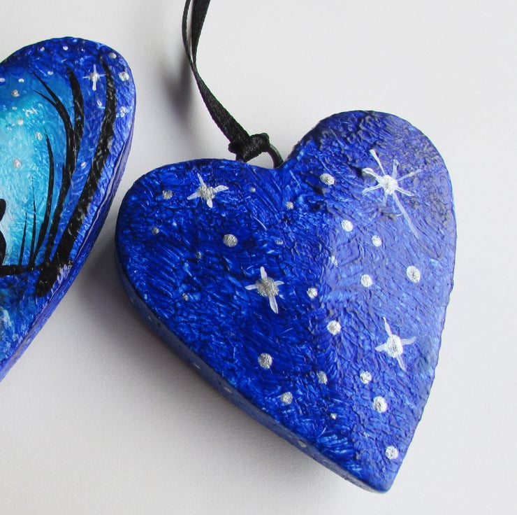 This Lovely Shaped Heart has been handpainted onto wood with acrylics and finished off with a coat of varnish. It has a black ribbon attached so you can hang it anywhere around the home, on a door handle, a headboard or dressing table mirror are just some places it would look good. Painted in shades of blue. The back is painted blue with silver stars.