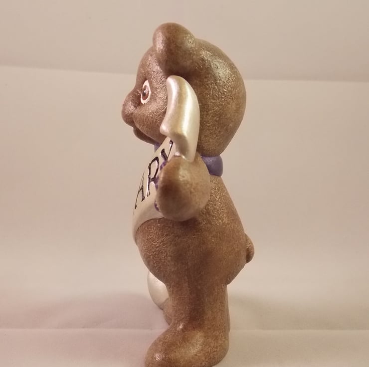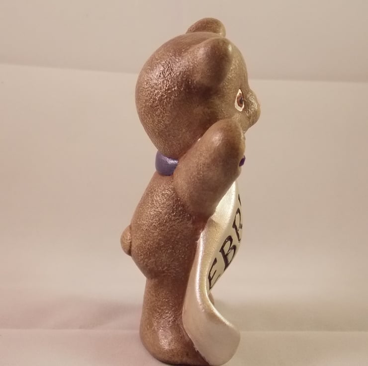 I have for sale a small ceramic birthstone bear, which was hand painted by myself. It is a standing animal figurine ornament, for the month of February. It has a banner across the front in black coloured letters, with the word February on and each paw has three tiny rhinestones in purple. This represents the colour of the birthstone - Amethyst. This would make a lovely keepsake, or perhaps given as a gift.