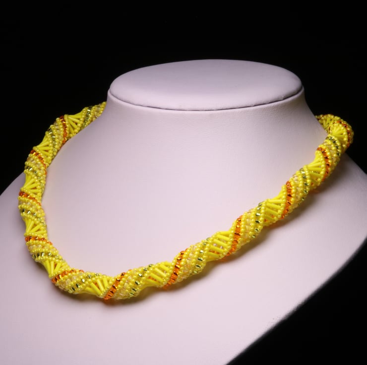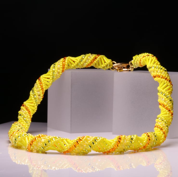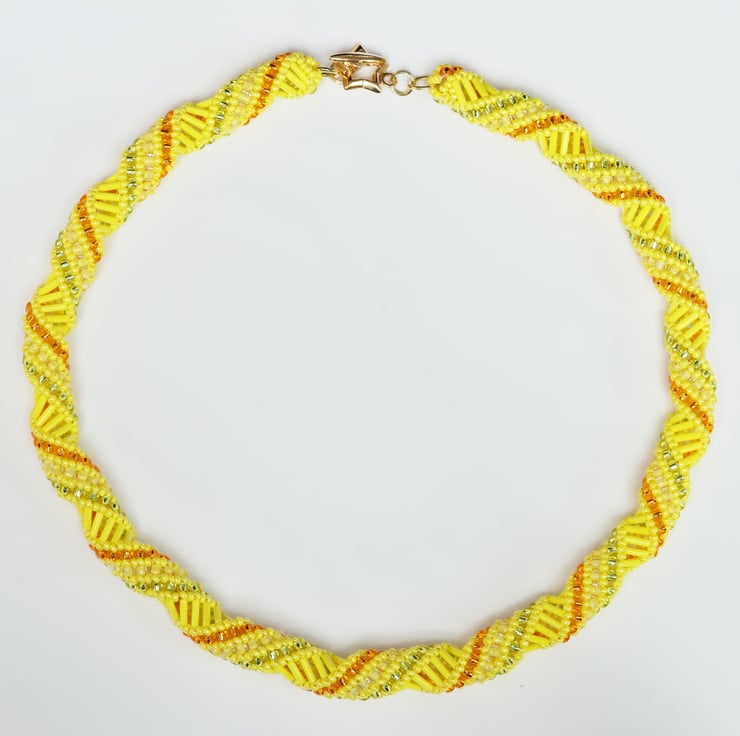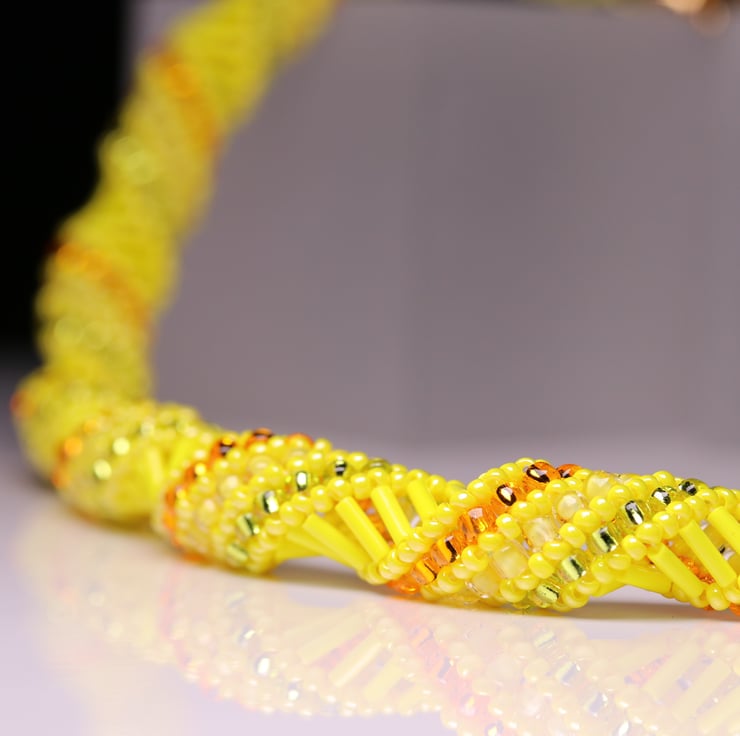 Colours to brighten up a dull day; a cheerful Russian Spiral rope necklace in bright yellow with a touch of orange and of lime green for contrast. The orange and lime green beads are silver lined for extra sparkle, whilst the sunshine yellow beads and bugle beads have a gloss finish. I have used 10lb Fireline braided beading thread to make the piece as robust as possible. It is also lightweight, being hollow inside. The piece is finished with a pretty gold-plated star shaped toggle clasp.
