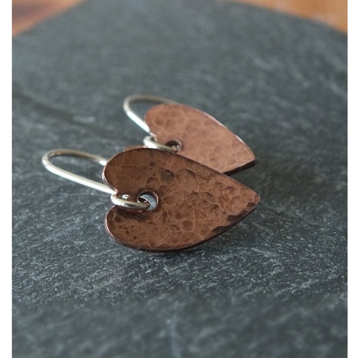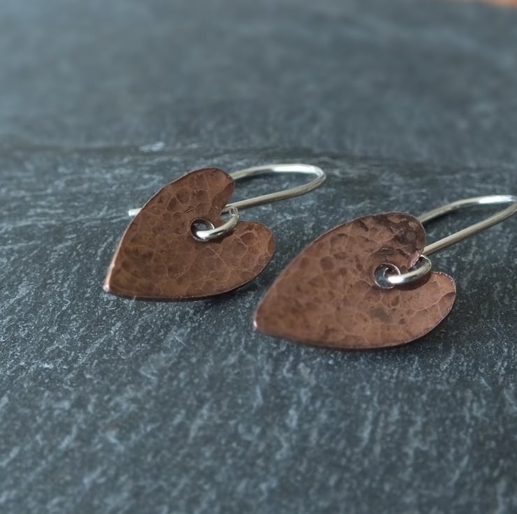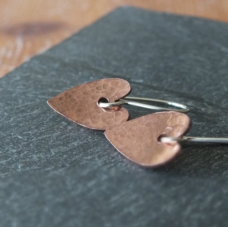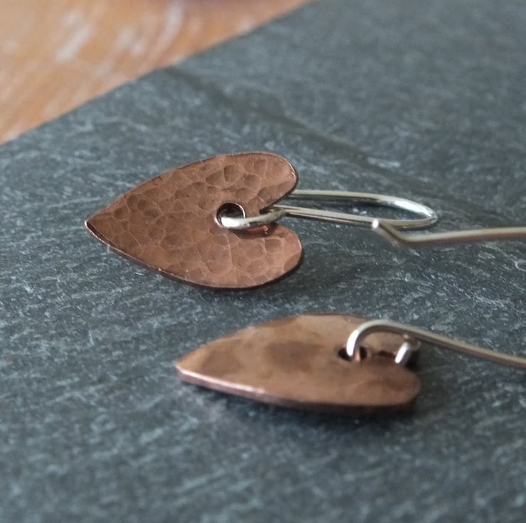 Hammered, elongated copper hearts, suspended from handmade sterling silver earring wires