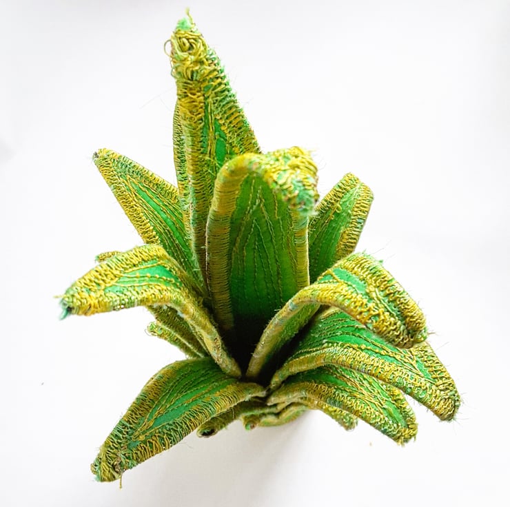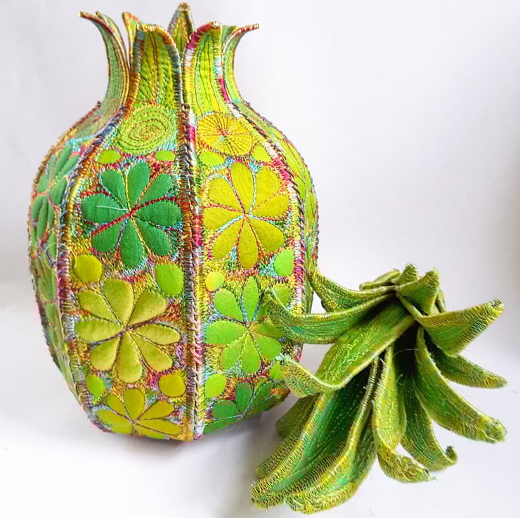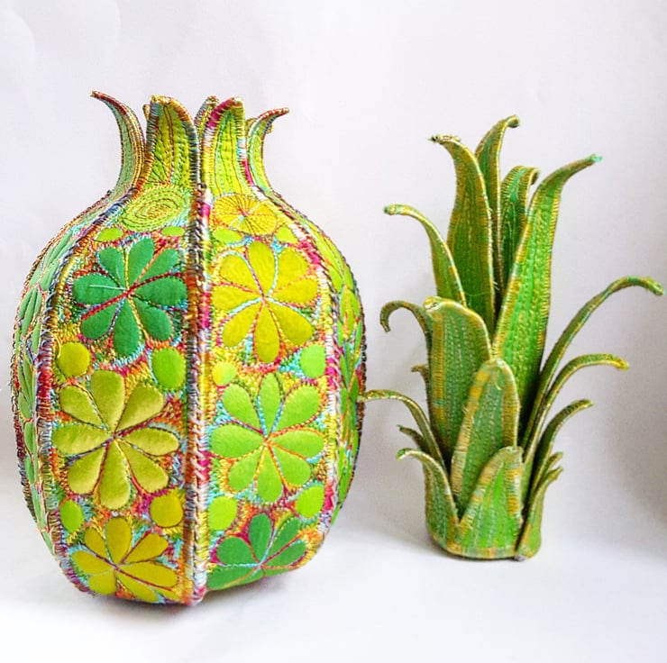 Made from layers of fabric including hand dyed Egyptian cotton and silk fabrics using the free machine embroidery style of sewing.