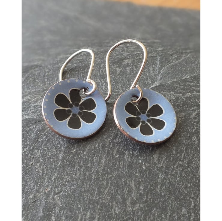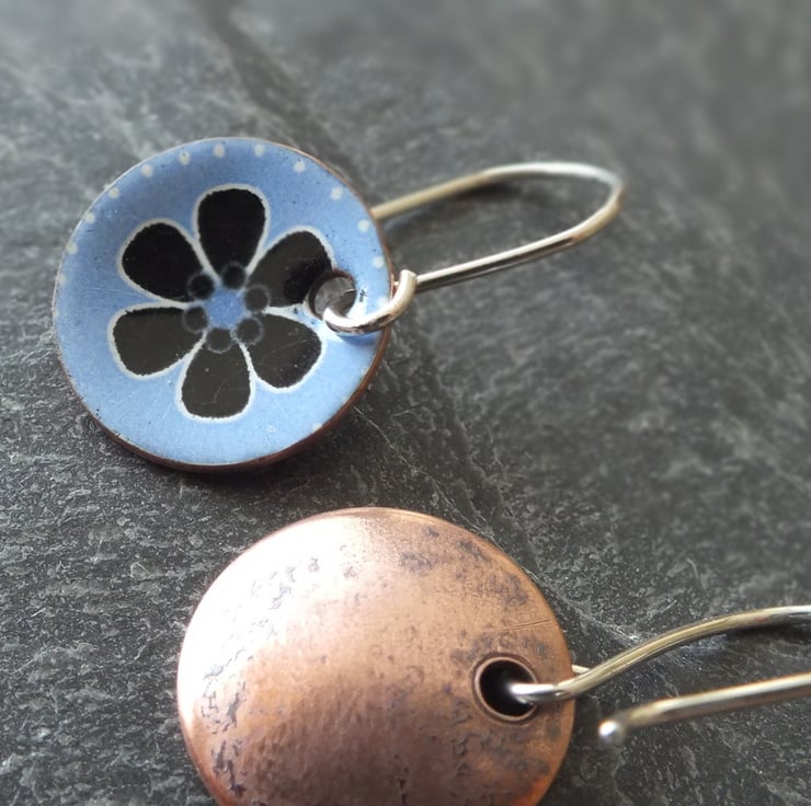 Black abstract flowers on a pale blue background, each earring is 1.5cm in diameter and is slightly concave, with a natural copper finish on the back. They are suspended from hand made sterling silver earring wires.