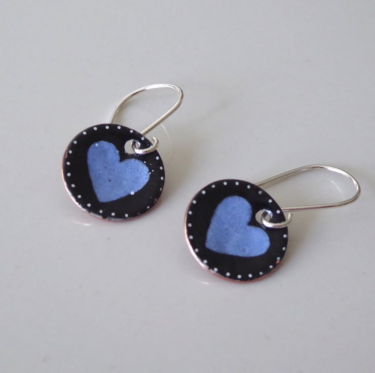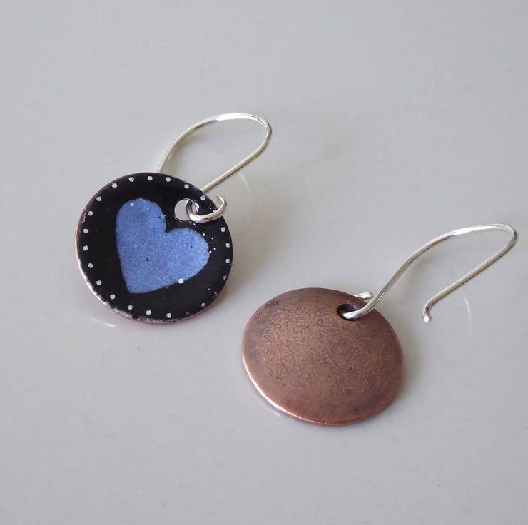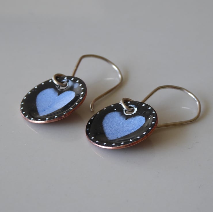 Pale blue hearts, on a black background, each earring is 1.5cm in diameter and is slightly concave, with a natural copper finish on the back. They are suspended from hand made sterling silver earring wires.
