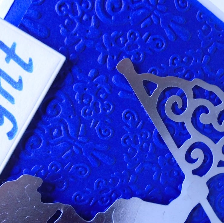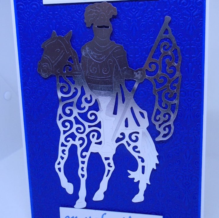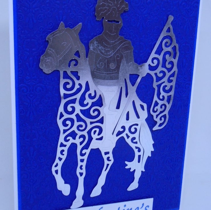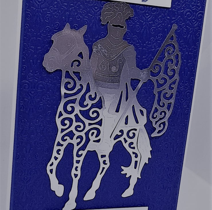 This card is A5 size and comes with a matching envelope hand made, the base of the card is coconut white and mat and layer is royal blue and deep blue card, I have embossed the top layer with a mediaeval pattern look, the knight has been hot foiled to give him that shiny look, this card is blank inside for your sentiment.