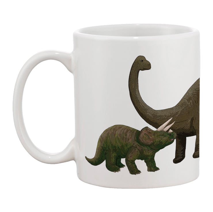 A fun mug with an illustrated trio of dinosaurs - a Diplodocus, Triceratops and the King of the Dinosaurs, the T Rex.
