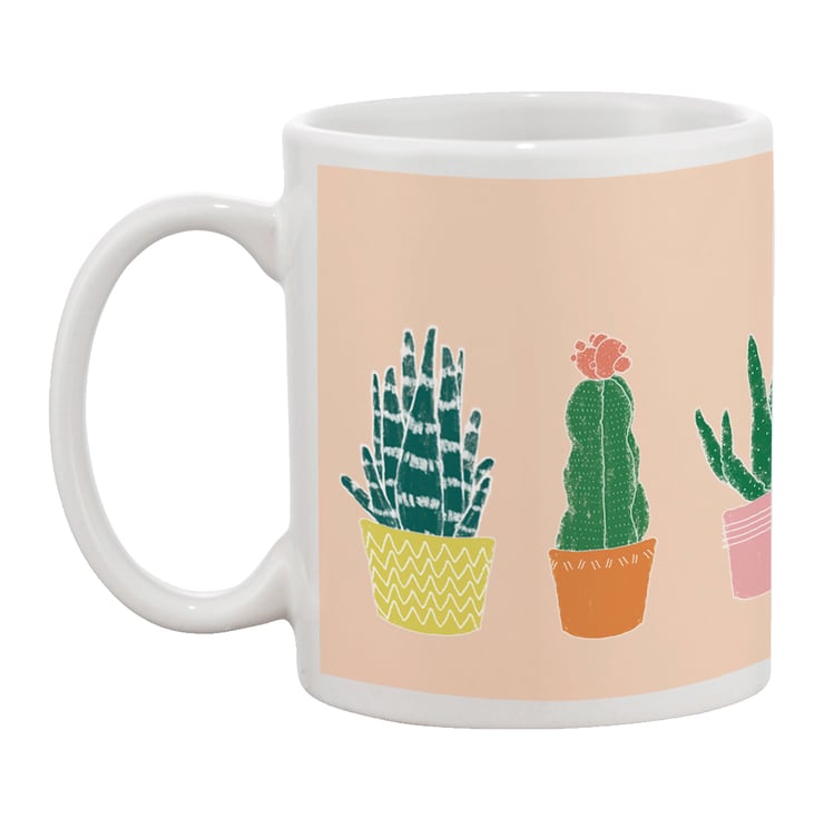 A cute mug featuring a design of succulents. This mug is also available with a light blue background. Please see my other listings for details. Matching coasters are also available.