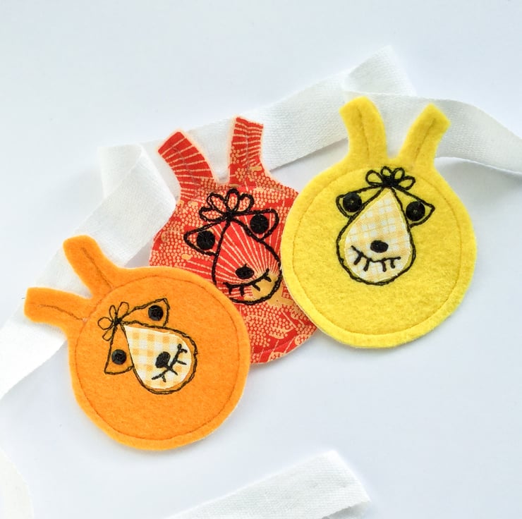 This little banner of bunting has been made using freemotion and hand embroidery. A childhood of the 70’s, inspiration came from space hoppers and vinyl records, less traditional than straight forward bunting, but now you will have no excuse not to celebrate. Each motif has its own quirky character, sequins, ribbons and buttons have been used for embellishments. A little bit of madness to hang on your walls.
