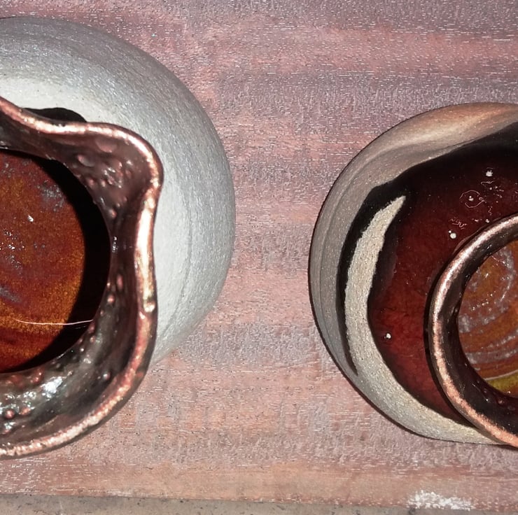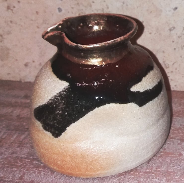 J1. A partially splashed glaze on the rim with bronzey/gold, small, round bellied jug with pinch 'handles' where your fingers sit to hold and pour. Glazed inside with a glossy easy clean orange glaze. Organic feel to using them
