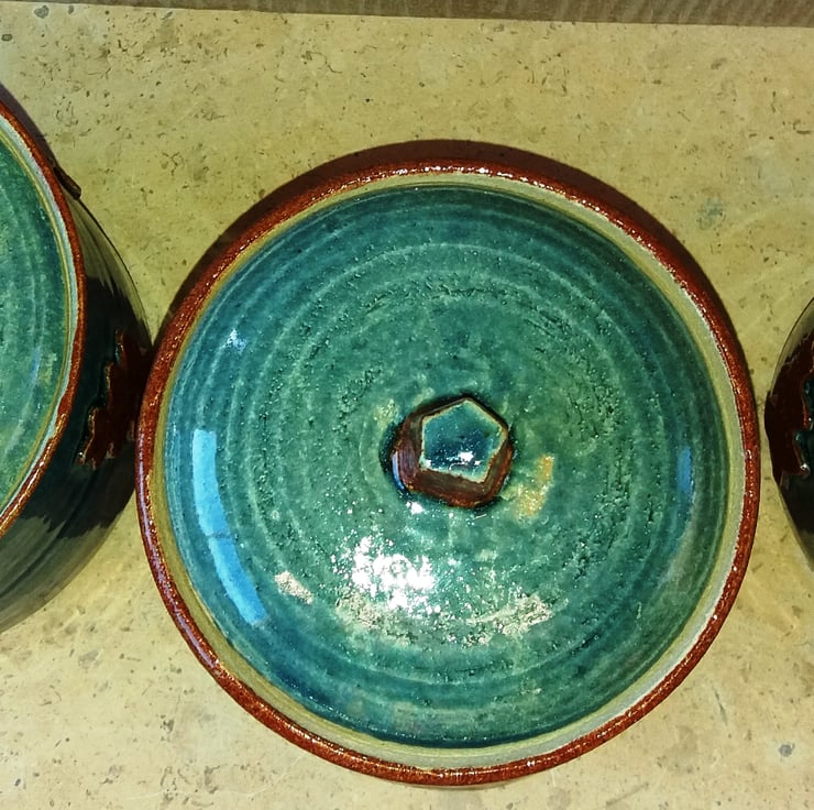 2. Middle size jar, green glossy glaze with 3 oak leaf decorations on body. Measures 12cm Diam x 9cm Deep, holds 950ml