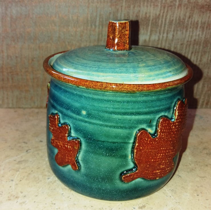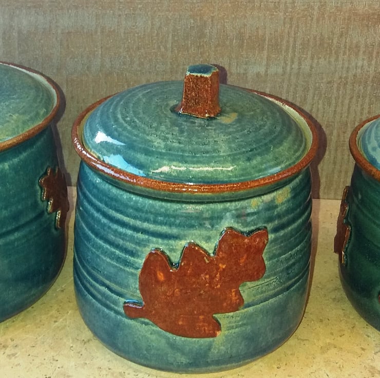 1. A ceramic stoneware jar with 4 oak leaves decorating the glossy green body and a 'pumpkin' style handle on the lid. Measures 13 1/2cm across x 9 1/2cm D x 9 1/2cm W at base, volume 1litre