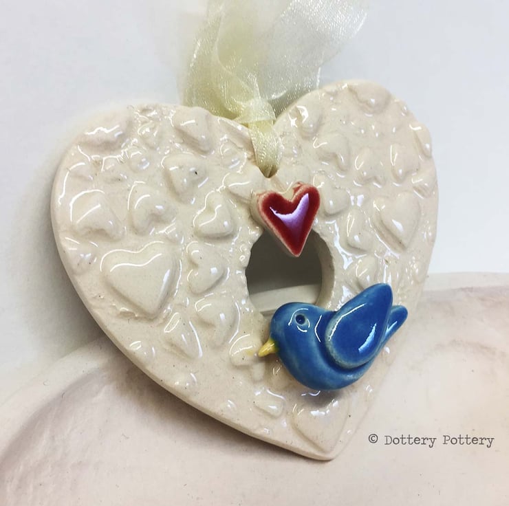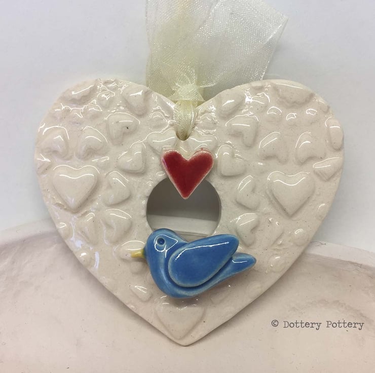 This ceramic heart decoration is made from white earthenware clay and decorated with an embossed heart pattern and finished with a little blue bird and red heart.