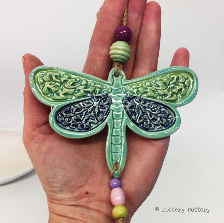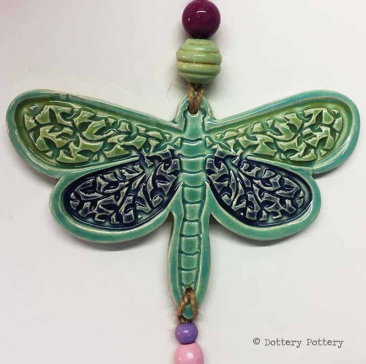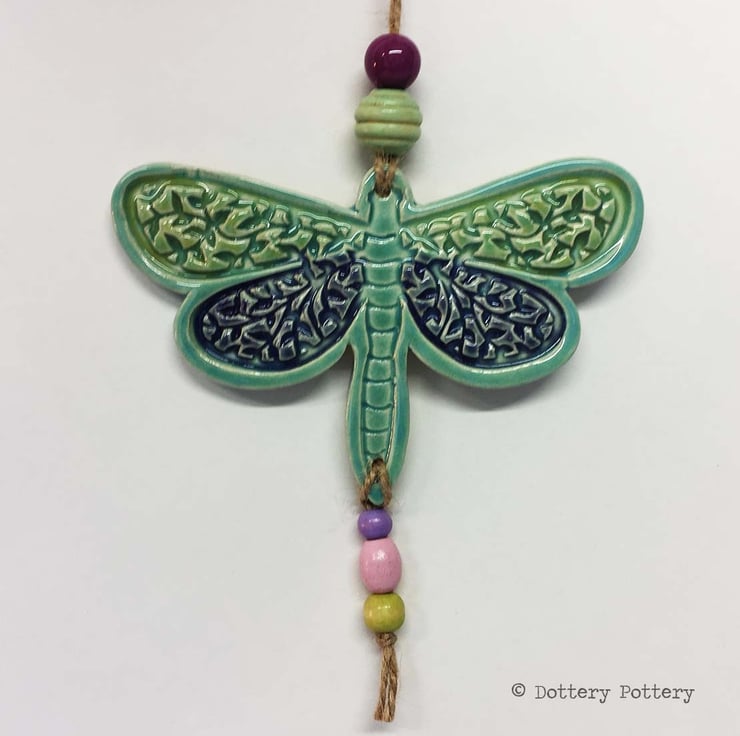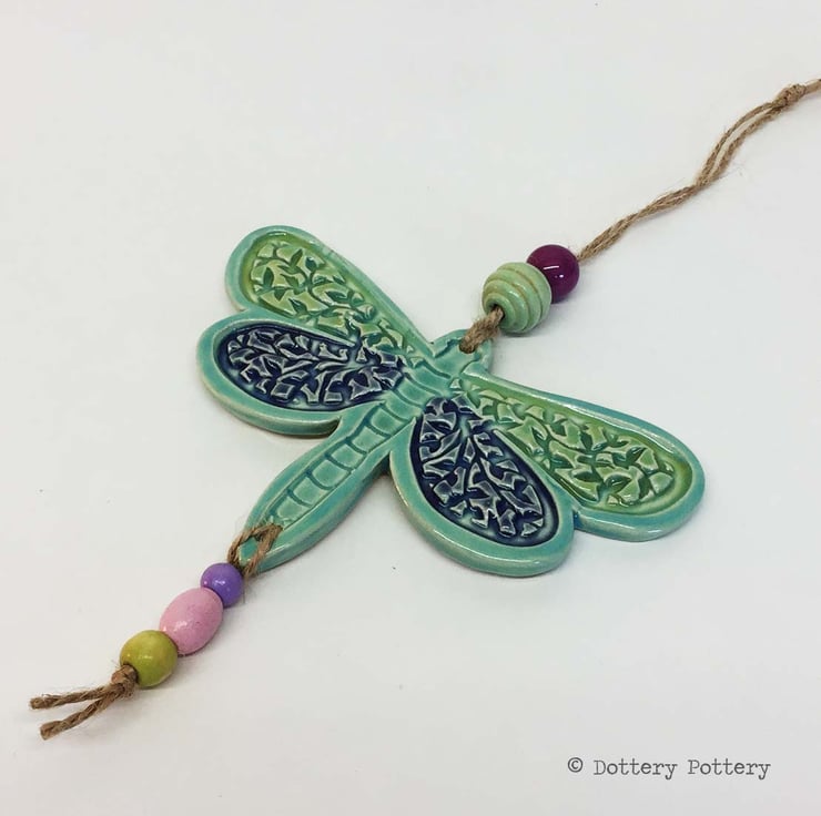 It has been decorated with bright, glossy glazes and finished with a rustic twine. It has a matching beads on the string to the head and tail.