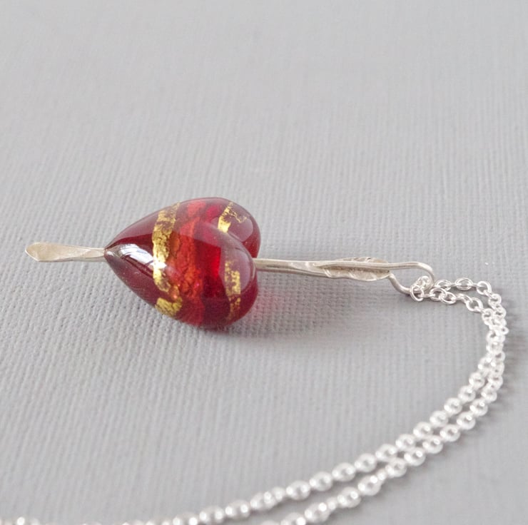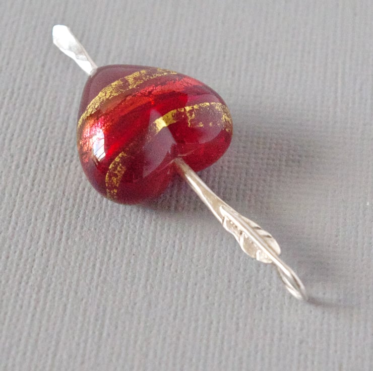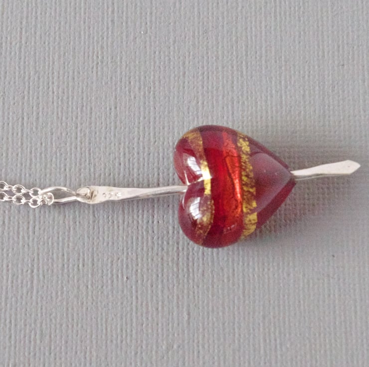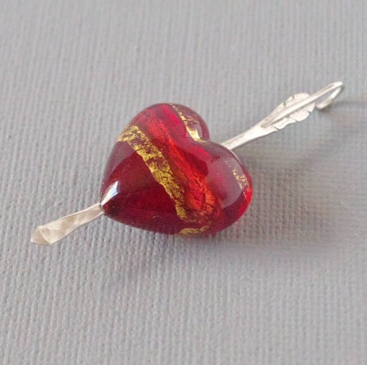 This Cupid's Dart Pendant has a ruby red Murano heart, encircled by a 24 karat gold band entrapped in the glass. The heart itself measures 18 mm long and is genuine Murano glass from Venice itself. This is definitely one of my favourite beads, because the red and gold colours appear liquid and are really intense. I have mounted this stunning work of art by crafting a sterling silver arrow entirely by a hand forging process of heating and hammering the metal, then carving out the details by hand such as the fletchings at the top of the shaft. I have stamped the arrow with the .925 mark as my warranty that it is genuine sterling silver. This makes each arrow unique and totally one of a kind. At 40 mm 1 3/4" long and mounted on a 450 mm 17 3/4" sterling silver chain, this pendant would make a beautiful gift which is sure to be appreciated and treasured for years to come.