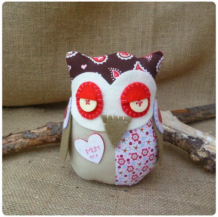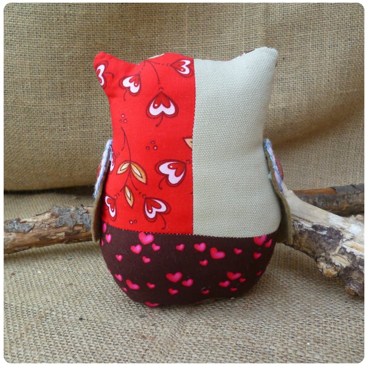 - Patchwork owl featuring hearts, paisley and floral cotton fabrics along with a beige linen