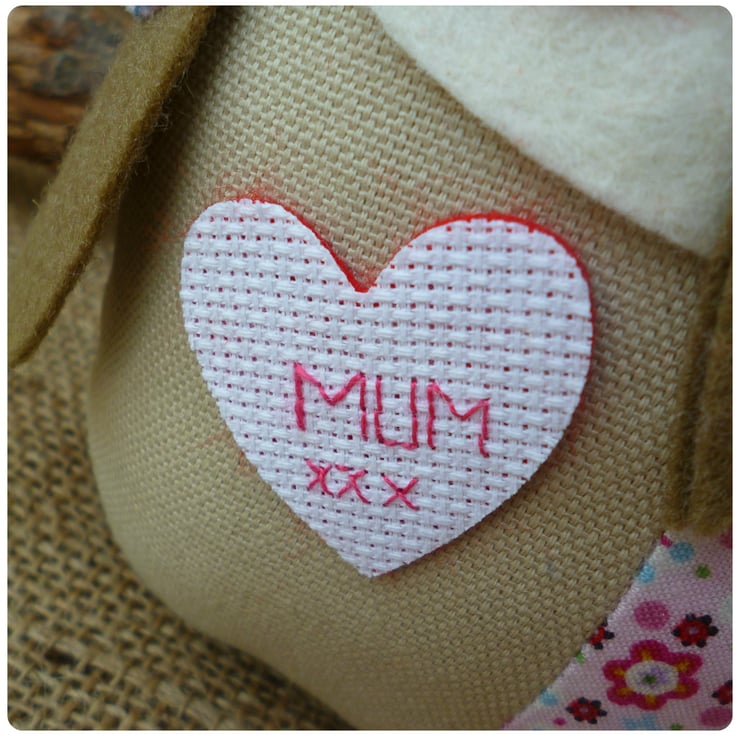 - She is finished with a heart on her belly cross-stitched with "Mum xx"
