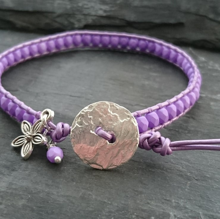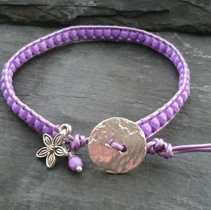 This bracelet has been made with soft metallic leather leather cord and faceted glass beads, both in a pretty shade of purple. A silver coloured button has been used for a fastener and a couple of charms add the finishing touch.
