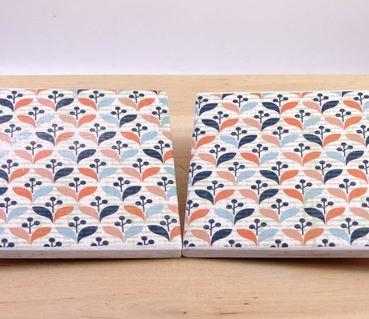 A pair of ceramic coasters measuring 10cm x 10cm decoupaged in a geometric design blue and beige paper. They have been coated with a layer of lacquer so they can be wiped with a damp cloth and have a circle of cork glued firmly to the base to protect your furniture. This item will be sent by Royal Mail packed to arrive safely.