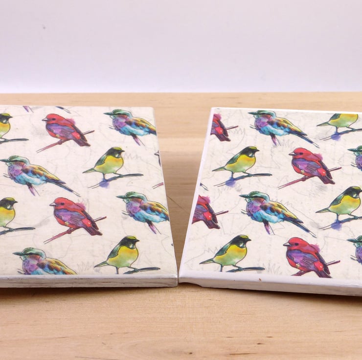 A pair of ceramic coasters measuring 10cm x 10cm decoupaged with a pretty bird print paper. The coasters have been given a coat of lacquer so they can be wiped with a damp cloth and have a circle of cork glued firmly to the base to protect your furniture. This item will be sent by Royal Mail packed to arrive safely.