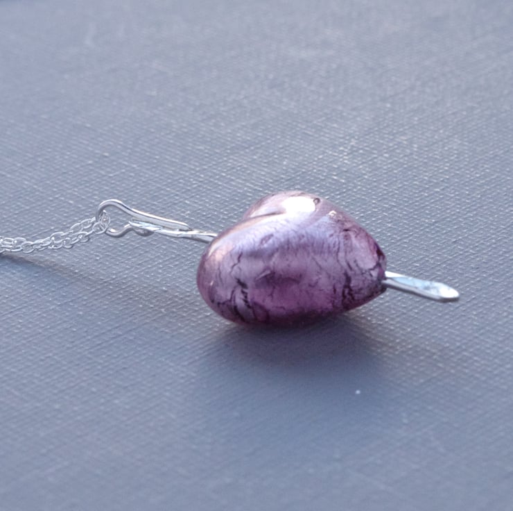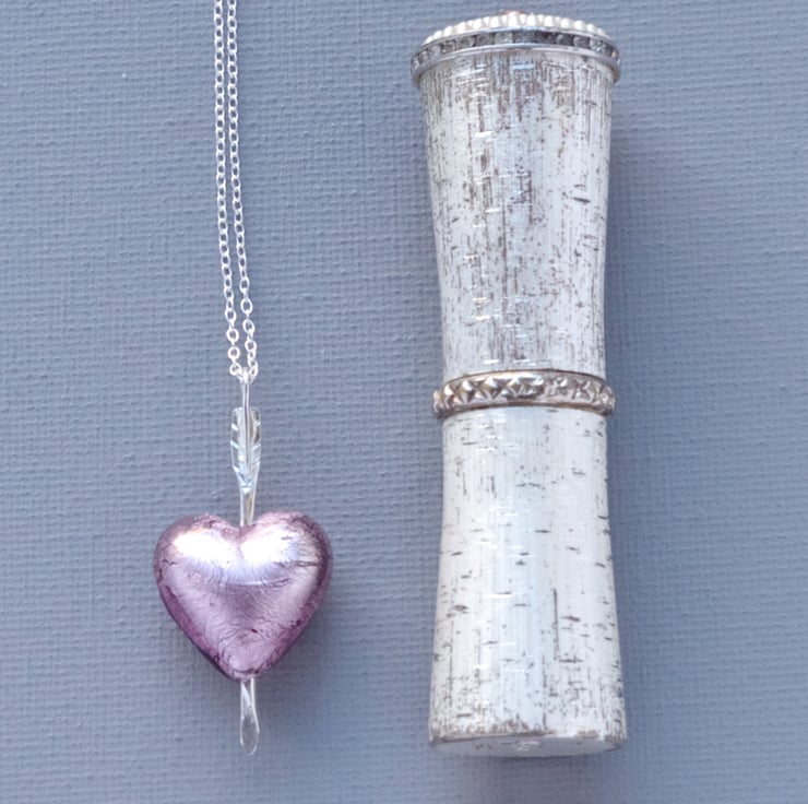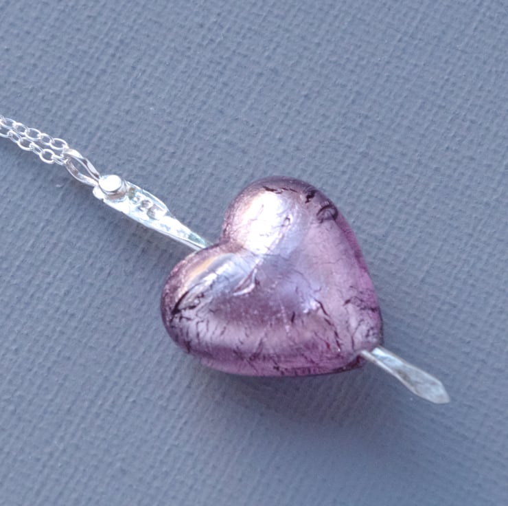 This stunning Murano Heart pendant is light amethyst in colour with a silver core that appears to make it glow from within. It is inspired by the Roman legend of Cupid and his magical bow. According to legend Cupid is a mischeivous boy who enjoys causing trouble for mortals by piercing their hearts with an arrow or dart from his bow, which makes them fall hopelessly in love. The heart itself measures 18 mm long and is genuine Murano glass from Venice itself. I have mounted this delicately beautiful work of art by crafting a sterling silver arrow entirely by a hand forging process of heating and hammering the metal, then carving out the details by hand such as the fletchings at the top of the shaft. This makes each arrow unique and totally one of a kind. At 40 mm 1 3/4" long and mounted on a 450 mm 17 3/4" sterling silver chain, this pendant would make a beautiful gift which is sure to be appreciated and treasured for years to come.
