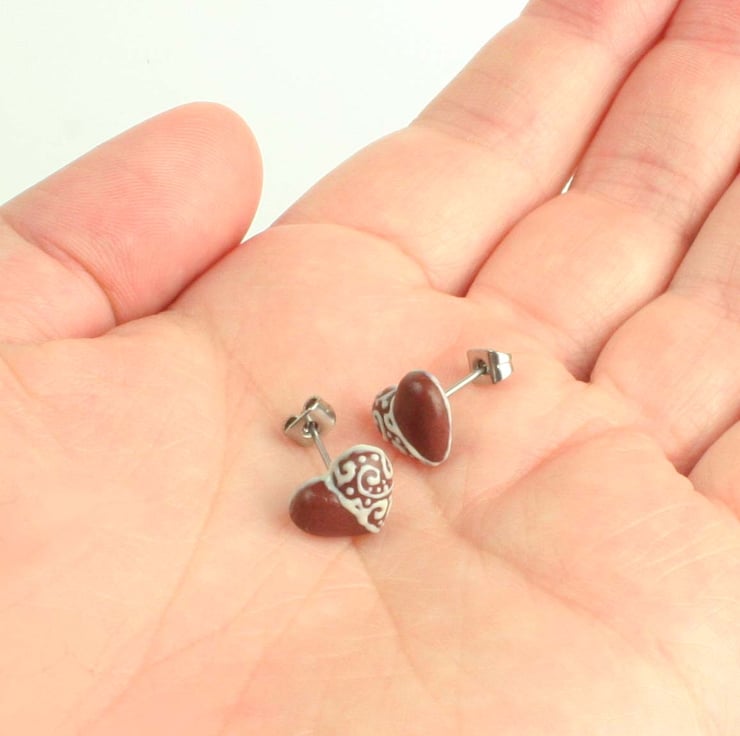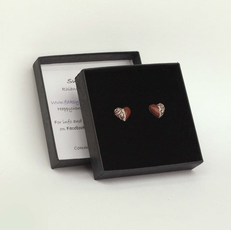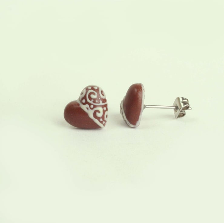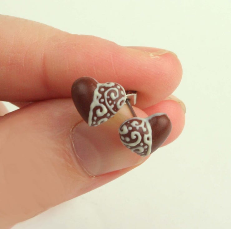 These cute faux chocolate heart stud earrings have been handmade in polymer clay, with a fancy filigree decoration for that extra posh choc look.