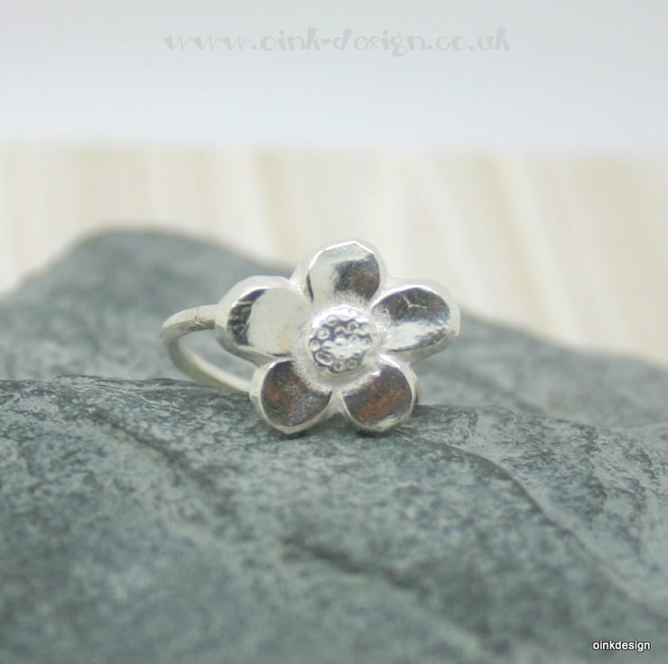 The shank of the ring is made from sterling silver (925) 2mm round wire and finished with a fine silver (999) flower.