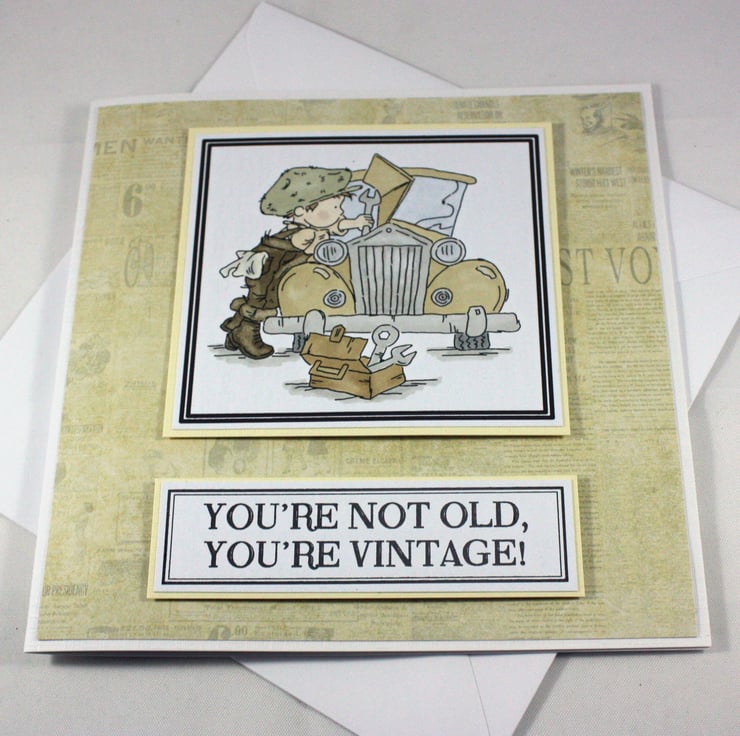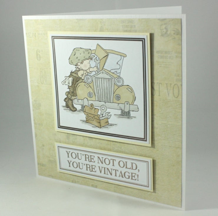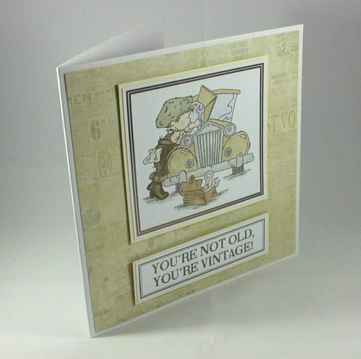 Square white linen card overlaid with vintage style background paper and a hand coloured image of a little boy working on a classic car. The message reads: 'You're not old, you're vintage!' Both the image, borders and message have been foiled.