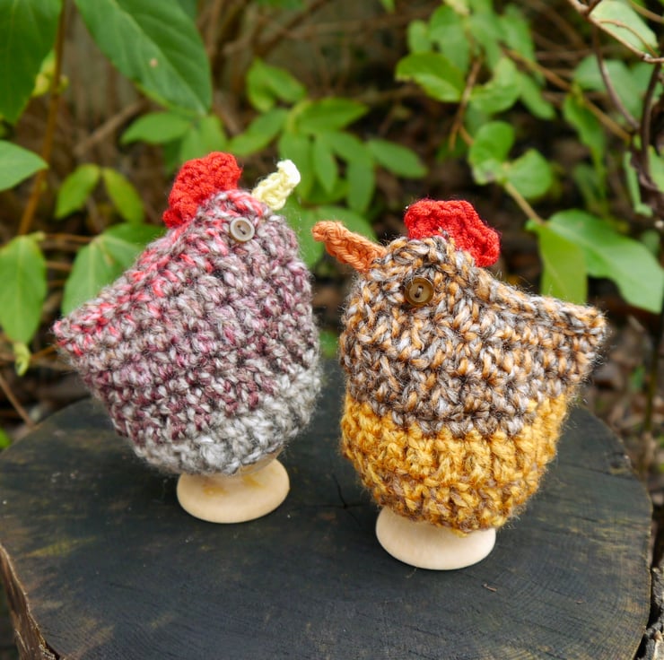 A cute little chicken egg cosy which is crocheted, made using a lovely marbled yarn in shades of red, brown and beige. I have sewn on brown buttons for eyes and there is a yellow beak and red comb attached. Other colours are available in my shop (please see photos).