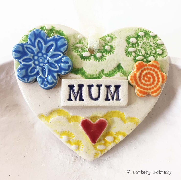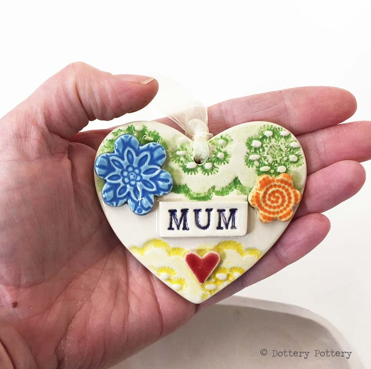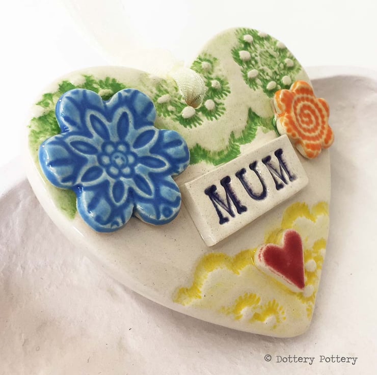 This ceramic heart decoration is made from white earthenware clay and decorated with pattern and colour.