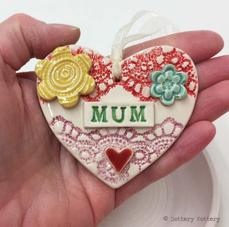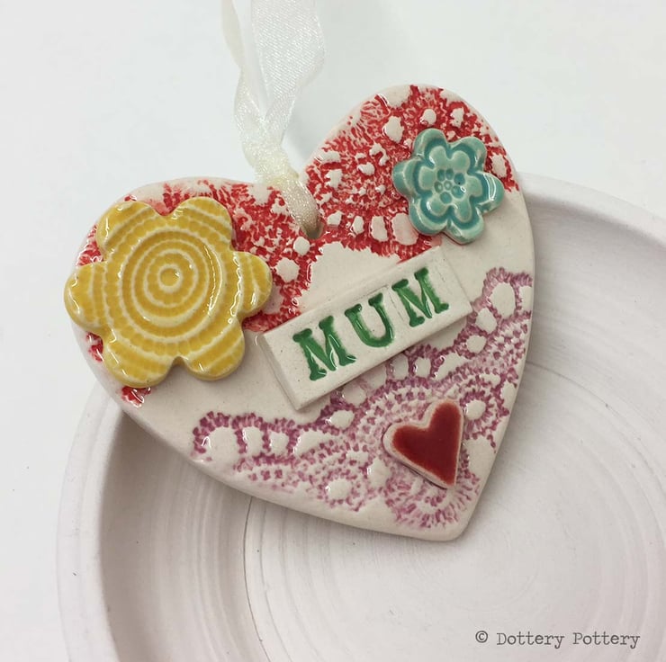 This ceramic heart decoration is made from white earthenware clay and decorated with pattern and colour.