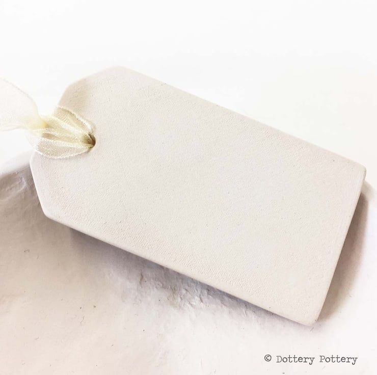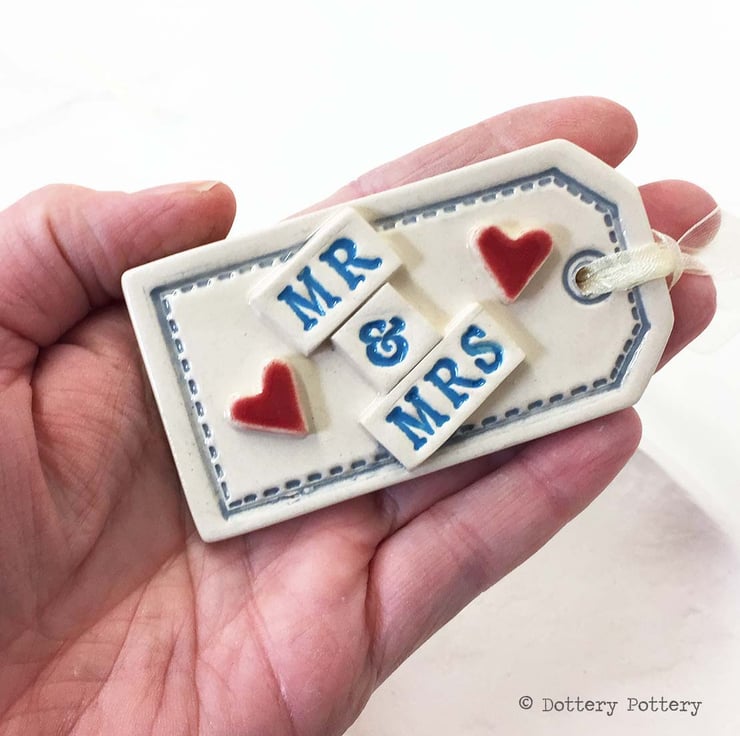 This tag decoration is made from white earthenware clay and is finished with the words "Mr & Mrs"