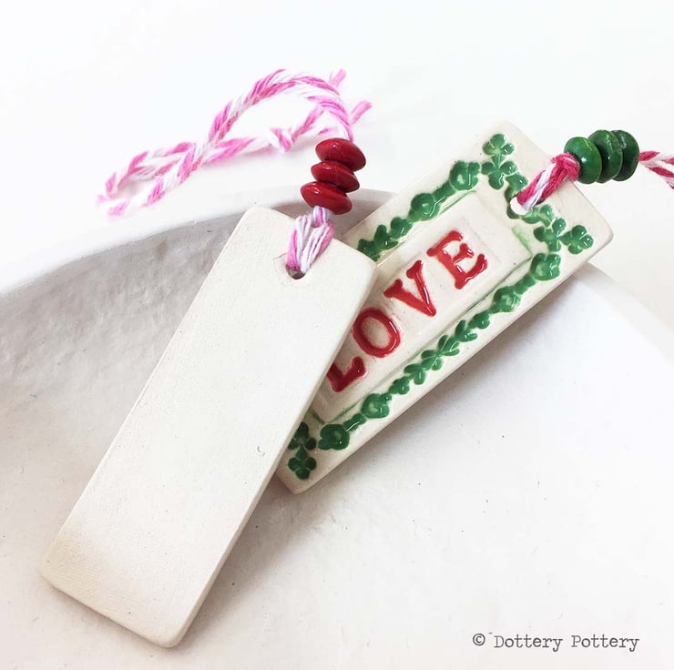 These little tag decorationsares made from white earthenware clay and finished with the word "Love"
