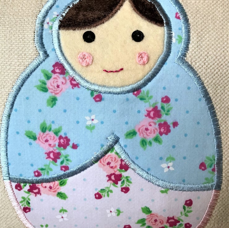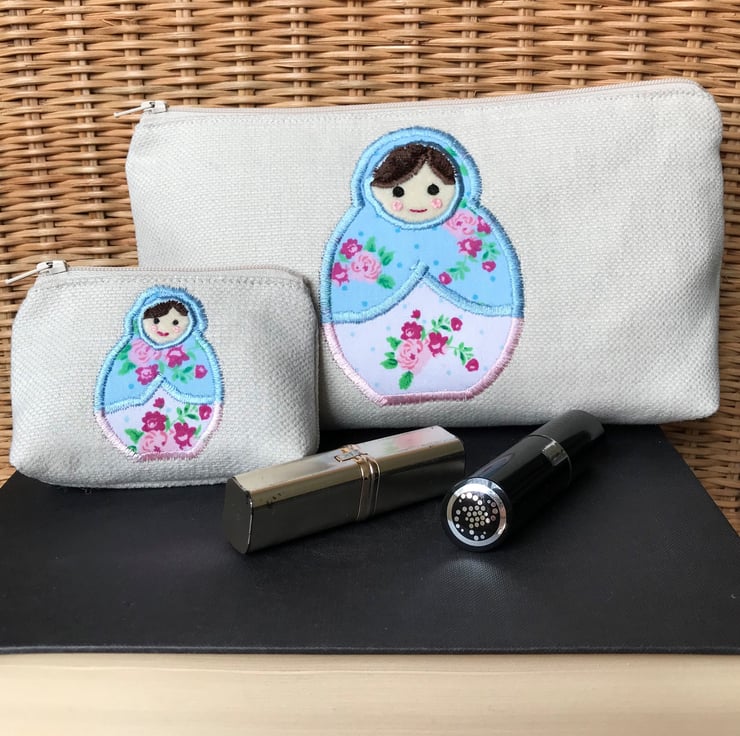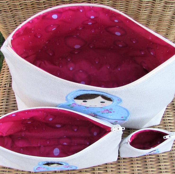 The bags are all made from good quality cream fabric. The fabrics used to make the Russian dolls are a matching blue fabric and white fabric, each with the same pretty floral print pattern in shades of pink, green and white with blue polka dots. The dolls' faces are made from flesh coloured felt and lovingly hand-embroidered. The two larger dolls have brown velvet hair and sequin eyes, whereas the smallest doll has embroidered hair and eyes. Each bag or purse has a cream zip fastening and is fully lined with water-resistant fabric in a deep pink colour with a pattern of white water droplets.