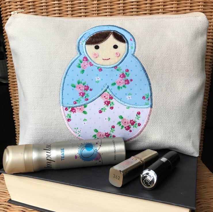 A delightfully quirky gift set which consists of a toiletry bag, a cosmetic bag and a small coin purse. The bags are all decorated with applique Russian dolls and they all stack inside each other just like Russian dolls.