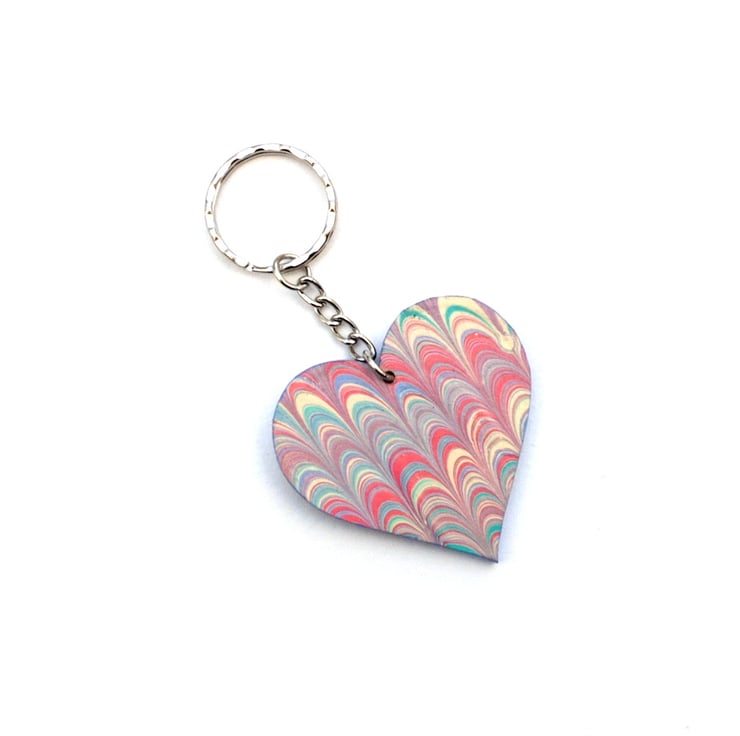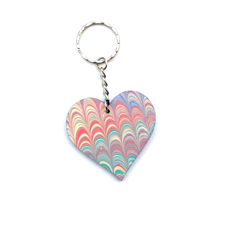 This lovely marbled paper wooden heart decoration features some of my own non pareil pattern marbled paper in a lovely colour palette of pink, cream green, and a little bit of blue.