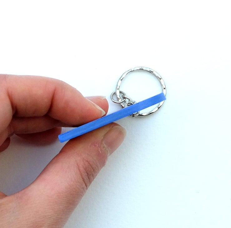 Double sided and coloured along the edges with matching blue acrylic it has then been covered with a light coat of varnish and finished with a 5cm metal keychain and ring. The split ring on the end has a 2.5cm diameter.
